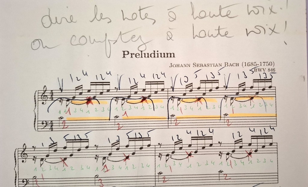 J’ai bien tenté de convaincre à la maison que je voulais prendre, moi aussi, des cours à cette époque. Malheureusement, lorsque l’on grandit dans un foyer modeste, il y a des priorités et l’instrument de musique ne fait pas partie de celles-ci. Et puis il y a des choses que le milieu ouvrier favorise en termes de sport et de musique. Le piano, comme le tennis étaient sans doute aussi considérés comme des distractions réservées à une certaine élite que nous n’étions pas. J’ai toujours regretté de ne pas avoir pu apprendre étant jeune mais je ne me suis pas découragé pour autant. Après le bac, j’ai dû financer mes études en travaillant à plein temps. Fac le jour, pion d’internat la nuit et le weekend, en guise de soupape de décompression, des cours de piano que je pouvais enfin m’offrir avec celle que j’avais si souvent observée étant gamin, Graziella. J’avais été très heureux qu’elle accepte de me donner des cours particuliers malgré mon emploi du temps assez contraint. Je me souviens encore de mon premier cours comme si c’était hier. La première gamme exécutée puis le premier véritable morceau. Un prélude de Bach, dont les premières notes sont représentées en illustration de cet article.