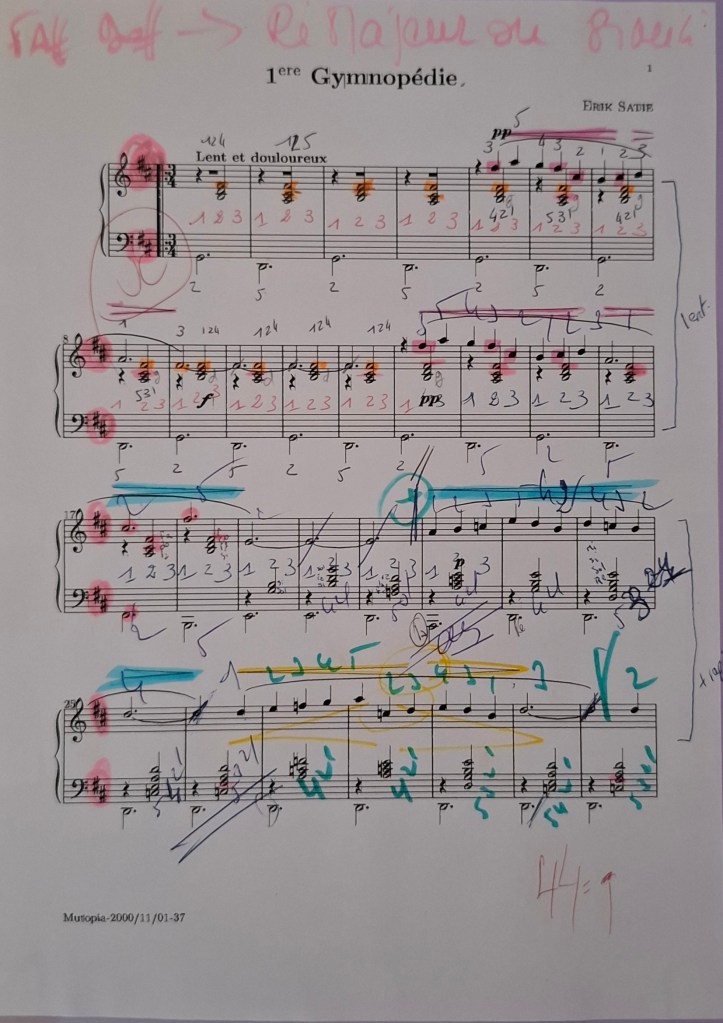 Deux années durant, j’ai souffert sur les exercices du Hanon mais j’ai aussi eu le plaisir immense d’apprendre auprès de Graziella différents morceaux que je joue encore de temps en temps : un Prélude de Bach, une Gymnopédie de Satie, la Valse d’Amélie de Yann Tiersen… J’ai effectivement conservé toutes mes partitions et elles m’ont suivi dans chacun de mes déménagements en France et à l’étranger. Lorsque j’ai débuté la Valse d’Amélie, j’ai acheté le cahier de partitions mais ai préféré travailler depuis une photocopie car ma prof avait la fâcheuse tendance à gribouiller le moindre centimètre carré des portées comme le montre ma partition de Satie ci-dessous. Elle avait ri lorsque je lui avais dit pourquoi j’avais amené une photocopie de Tiersen alors que je tenais l’original de l’autre main.