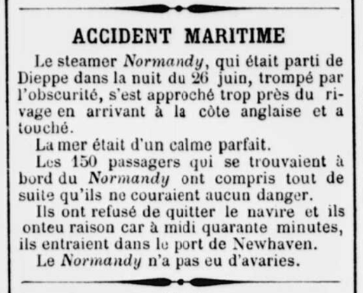 Une Mercantile Navy List de 1890 indique, quant à elle, que le Normandy II, dont les dimensions étaient de 231 pieds de long pour 27 pieds de large (= 70m de long x 8m de large) avait une coque en acier et a été construit aux ateliers de Glasgow [14]. Un rapport officiel a été retrouvé [15] ; rapport rédigé à la suite d’un incident s’étant déroulé lors d’une traversée Dieppe-Newhaven le 25 juin 1891 menée par le Capitaine Lewis, soit un peu moins de trois ans après la « traversée impériale ». On y apprend de nombreuses informations à propos du navire, notamment concernant sa vitesse de pointe, puisque le document indique que les moteurs ont été lancés à plein régime peu de temps après avoir quitté le port dieppois, permettant au vaisseau d’avancer à 16 nœuds par heure, soit un peu moins de 30km/h. Quelques heures plus tard, arrivé à proximité des côtes britanniques à Beachy Head, le navire a touché le fond en raison du brouillard. La Vigie de Dieppe [16] indique que le steamer n’a pas été endommagé et a pu mener les 150 passagers jusqu’au port de Newhaven :