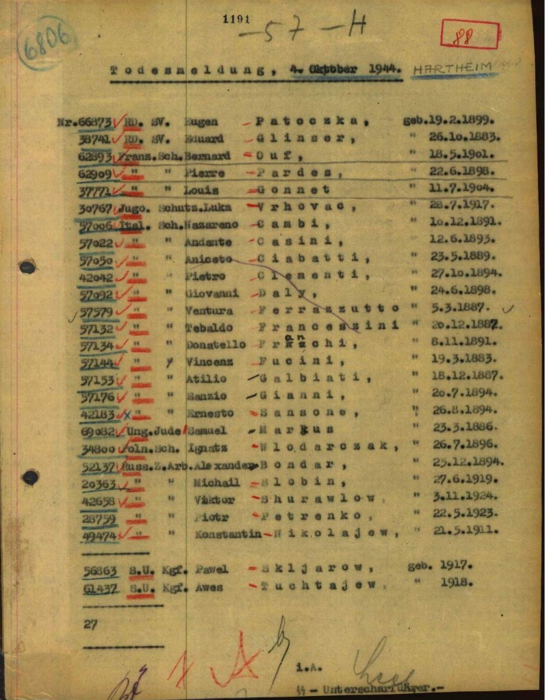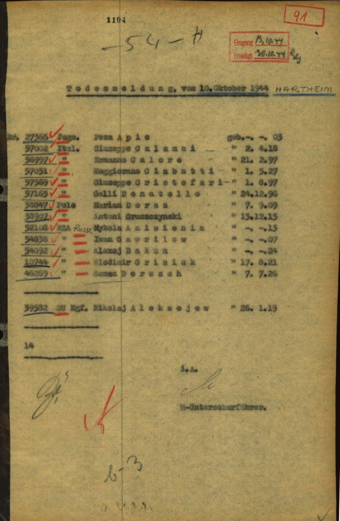 Ce phénomène de dates volontairement erronées pour le décès des concentrationnaires a été confirmé par la découverte d’un document important aux archives de Caen au début des années 2000. Ce que les chercheurs ont appelé la « Liste polonaise », parce que rédigé dans l’idiome de ce pays, recense effectivement l’identité de certaines victimes de la deuxième phase de l’Aktion 14f13 à Hartheim. Cette liste est malheureusement fragmentaire mais est véritablement indispensable pour comprendre la « Sonderbehandlung 14f13 » puisque pour certains déportés figurent la date officielle de décès attribuée par les nazis mais surtout la date réelle de l’assassinat par gaz derrière les murs du château de Hartheim. Pour les deux hommes qui nous préoccupent, cette date apparait bien, confirmant ainsi que les nazis ont clairement menti. Et comme le dit Florian Schwanninger dans la Revue d’Histoire de la Shoah, l’on constate bien un délai de plusieurs mois entre la date réelle et la date officielle. Selon le document, le père aurait été assassiné le 28 juin 1944 tandis que son fils l’aurait suivi dans la mort le 3 juillet suivant. Rappelons que celui-ci était âgé de seulement 17 ans.