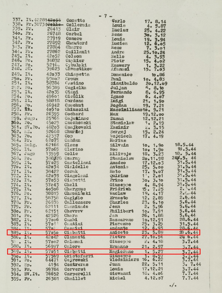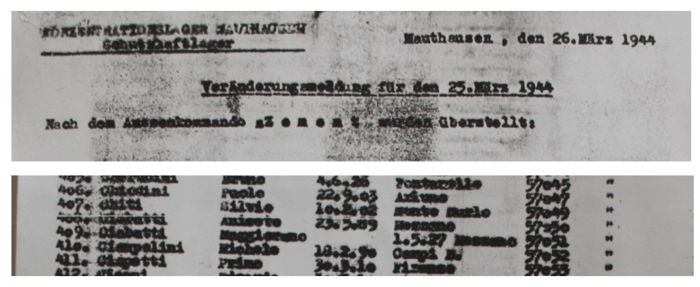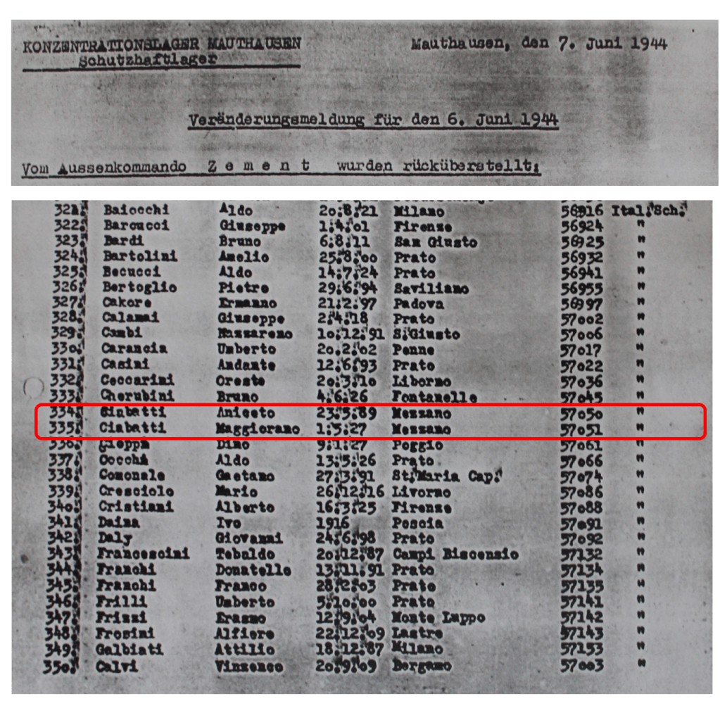 A Prato, les ouvriers textiles ayant participé à cette grève ont été rapidement arrêtés puis transférés à Florence où avaient été rassemblés ceux raflés dans toute la Toscane. L’après-midi du 8 mars, ceux encore en détention sont amenés à la gare Santa Maria Novella, d’où ils partent en direction du camp de concentration de Mauthausen en Autriche rattachée et où ils arrivent le 11 mars 1944. Après quelques jours de quarantaine, nombre de ces déportés sont transférés au camp d’Ebensee ; kommando satellite en lien avec les armes de représailles V2 ouvert quelques mois plus tôt. Parmi ces hommes, l’on retrouve Aniceto et Maggiorano Ciabatti. C’est ce que montre la liste de transfert du 25 mars 1944, dont une copie se trouve aujourd’hui au Zeitgeschichte Museum Ebensee. Il s’agit ici d’un très gros convoi de nouveaux arrivants composé de plus de 1 000 hommes.