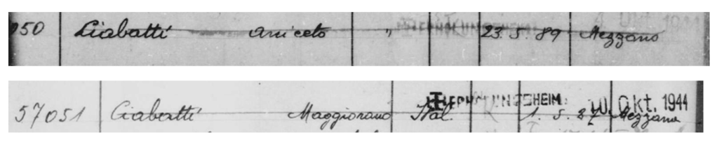 En réalité, si l’on se fie au vocabulaire nazi, les deux hommes ont été transférés non pas dans une chambre à gaz mais dans un « centre de remise en forme », « Erholungsheim » en allemand. Nous sommes ici en plein dans ce que Victor Klemperer a nommé la lingua tertii imperii, la langue du troisième Reich. Pour cacher leurs crimes, les nazis avaient effectivement pour habitude d’utiliser des termes moins choquants que ceux que l’on attendrait. L’assassinat des handicapés par gaz dans le cadre de l’Aktion T4 est par exemple souvent décrit comme étant un « endormissement ». Il n’est d’ailleurs pas question d’ »assassinats » dans le jargon nazi mais d’ »euthanasie ». Ici, alors que les nazis savaient très bien qu’ils envoyaient les concentrationnaires à la mort, ils parlent d’un transfert dans un « centre de remise en forme ». Le premier des deux Italiens à avoir été transféré est le père, le 4 octobre 1944 tandis que son fils l’aurait suivi six jours plus tard. Le mot « Erholungsheim » apparait clairement à côté de l’identité des deux hommes dans le registre mentionné ci-dessus. La croix potencée présente, elle aussi, trahit pourtant le sort qui a été réservé aux deux hommes.