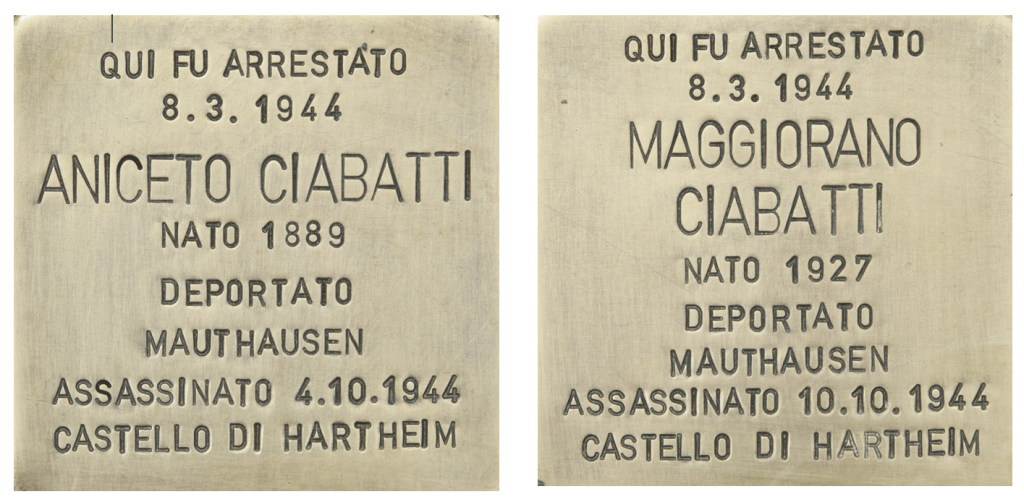 L’histoire pourrait s’arrêter là et l’on pourrait croire de prime abord que les deux hommes sont morts à cette date. C’est d’ailleurs bien ces deux dates qui figurent sur les pierres d’achoppement installées il y a quelques années à Prato par l’artiste allemand Gunter Demnig en mémoire des deux hommes. Il y est en effet inscrit : « Ici fut arrêté le 8.3.1944 Aniceto CIABATTI. Né en 1889. Déporté à Mauthausen. Assassiné le 4.10.1944 au château de Hartheim ». La même erreur est notée sur la pierre honorant le fils : « Ici fut arrêté le 8.3.1944 Maggiorano CIABATTI. Né en 1927. Déporté à Mauthausen. Assassiné le 10.10.1944 au château de Hartheim« .