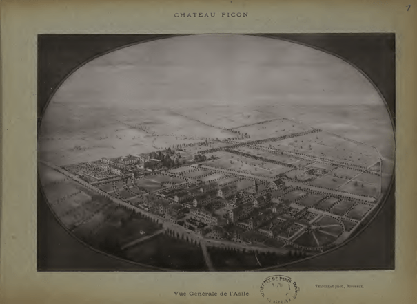 Vue générale de Château Picon. Source : Ouvrage de 1895 intitulé Maison de Santé de Château Picon – Asile Public d’Aliénées de Bordeaux. ( https://archive.org/details/BIUSante_09176/page/n3/mode/2up)
