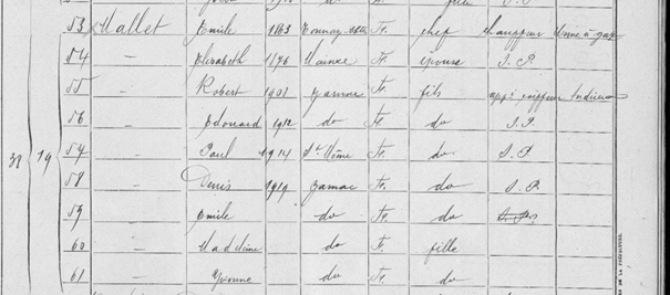 A plusieurs reprises au cours de mes recherches, j’ai lu qu’Elisabeth et Emile avaient eu neuf enfants, ce qui me pose véritablement question puisqu’à ce jour, je n’ai réussi à en identifier que huit. Qui était le neuvième ? Un enfant mort-né ? Où aurait-il alors vu le jour ? Un autre enfant du couple interroge puisque concernant Robert, l’on sait qu’il est né en 1908. En 1921, il apparait bien sur le recensement de la ville de Jarnac. Il est d’ailleurs précisé qu’il est apprenti coiffeur à cette époque. Il a alors 13 ans. Après cela, nous perdons toute trace. Est-il lui aussi décédé au sortir de l’adolescence ? Ou bien a-t-il décidé de partir ailleurs ? Je reste sceptique sur cette dernière possibilité car même dans ce cas, l’on arriverait à trouver des informations.